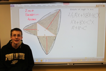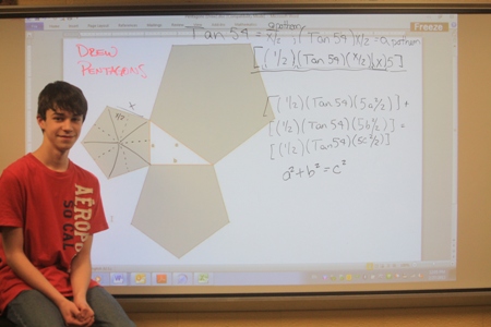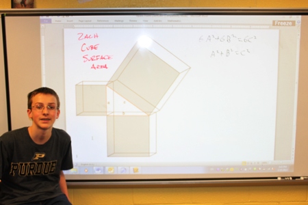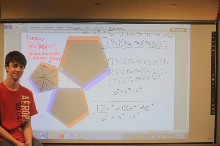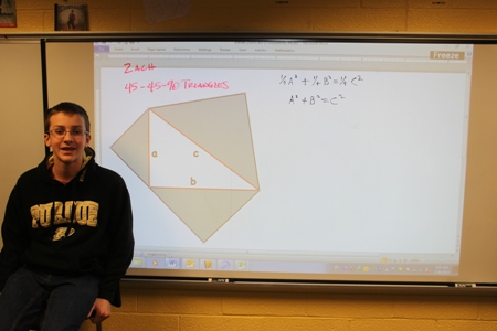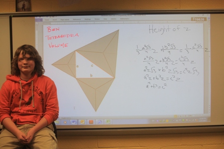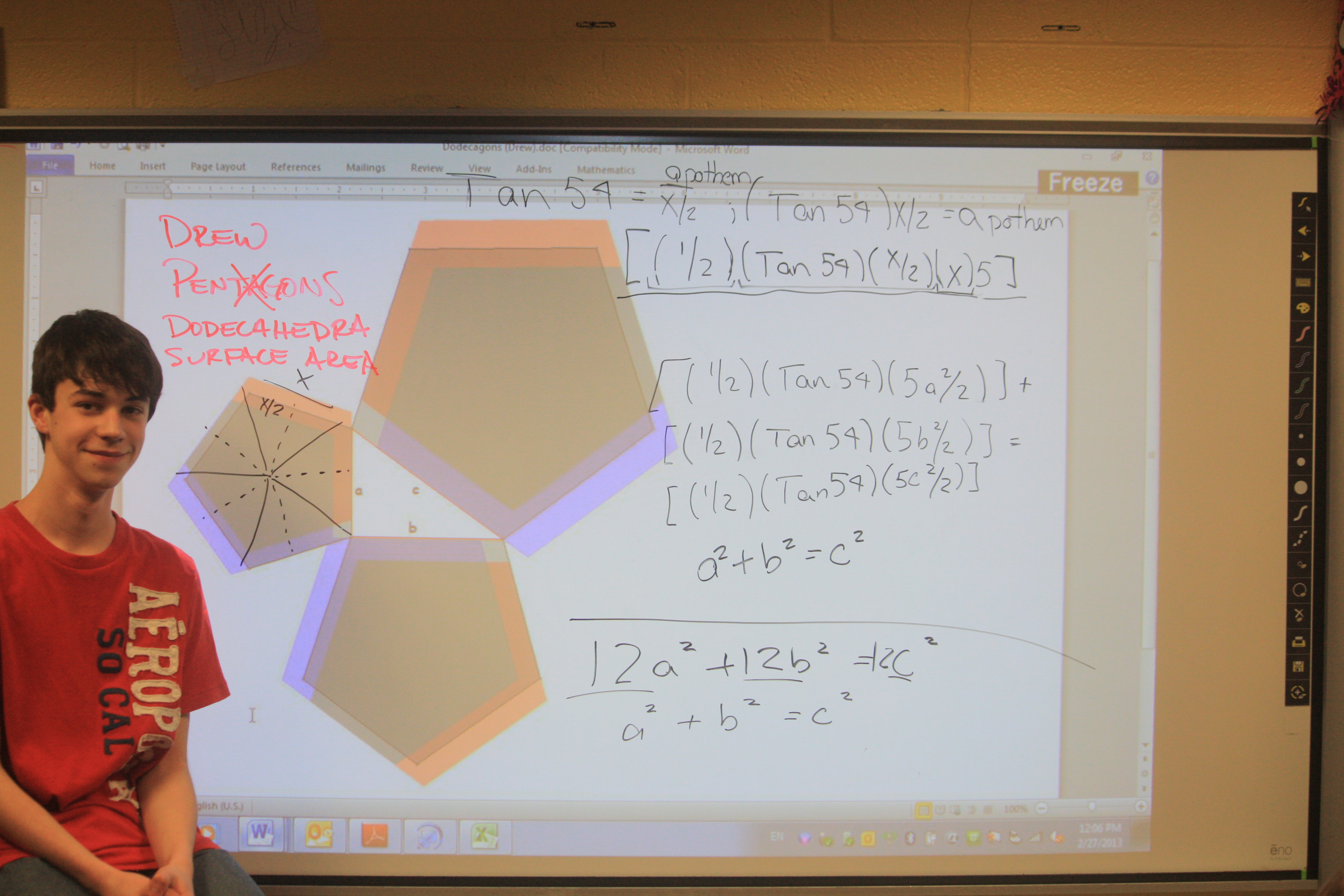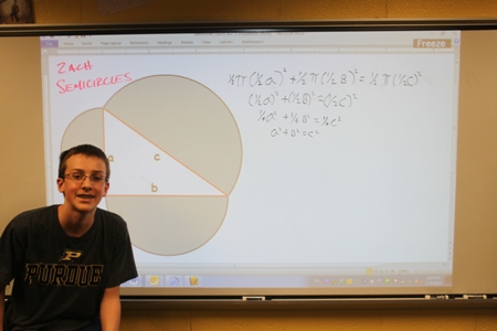 |    Zach broke the ice with a proof involving semicircles. Soon afterward, however, so many kids were weighing in that they began to become a bit territorial. To make sure we knew who got dibs on what, we started an ownership board. (Don't read it too closely ... not all of our wishes came true.) The board not only reserved shapes for specific kids, but it also helped to accelerate a sort of arms race between the more competitive of the group.    And speaking of competitive, two of the kids who took Algebra 1 the previous year as seventh-graders had been getting pretty jealous of the class as the kids worked their way through 42b and the Rock Problem; if you see some new faces below, it's because the class finally took pity on Ben and Carl.    We shared this initial group of findings with Dr. Wiggins. Click any photo to enlarge it. |